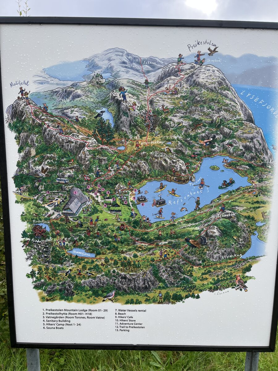 下山後在登山口附近晃晃,有個插圖牌子介紹,原來這裡還有其他爬山路線,也還有很多活動可以做,例如泡湖後烤桑拿,這個插圖畫得超棒超可愛,還把地精也畫進去了。真想在這裡再待個幾天啊!