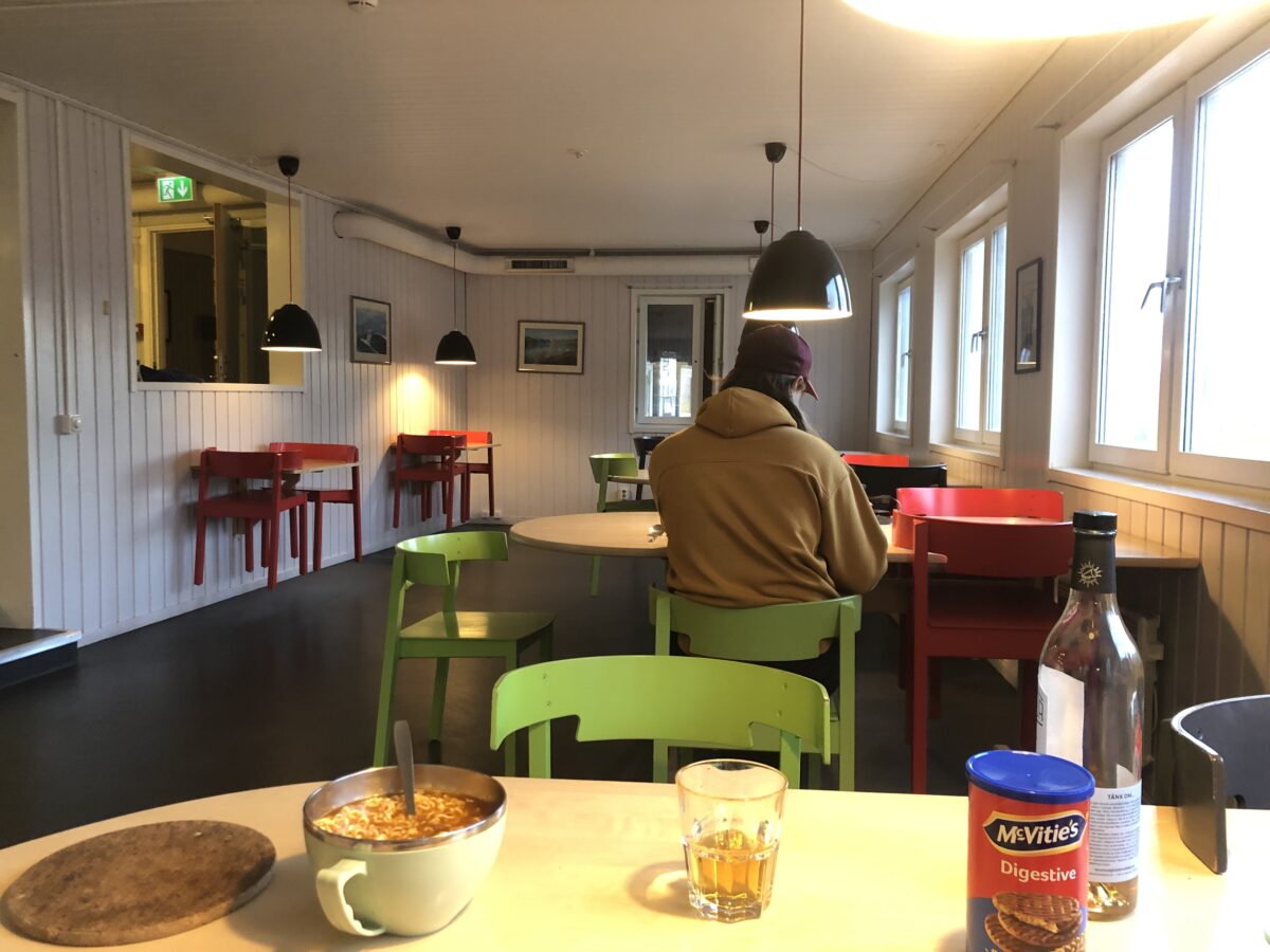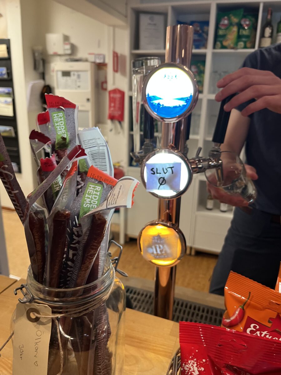 Kebnekaise 山屋隱藏在山林中,差點沒發現它,直到剩 500 公尺才看見建築一角。這裡的規模超大,內裝豪華,難怪住宿比較貴。進去後先 Check-in,櫃檯人員介紹廚房、房間、桑拿資訊。柚子馬上點了一杯現拉生啤,在交誼廳大口暢飲,直呼超過癮。