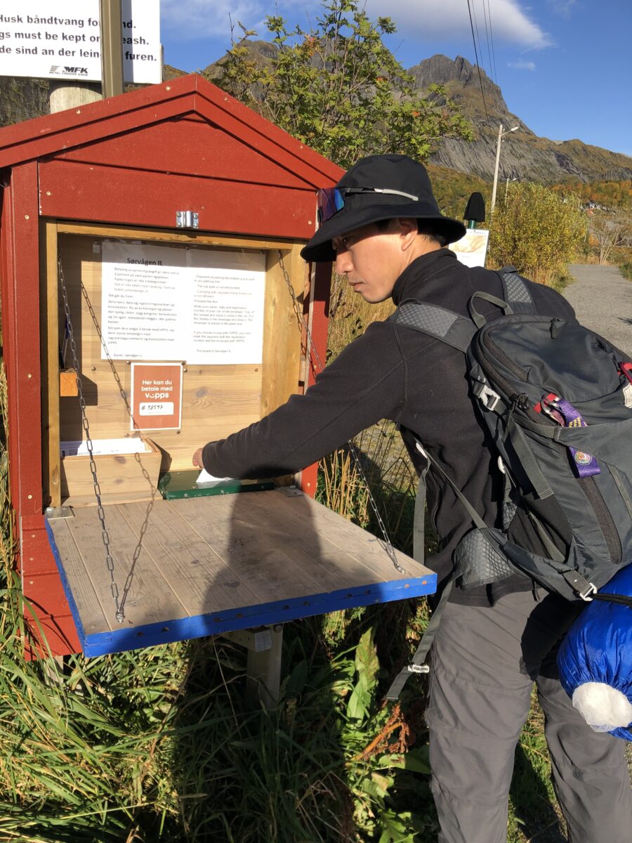 Reinebringen 兩個免費停車場全滿,Reine雷納小鎮內的停車場似乎也挺遠的,我們只好先轉戰 M 步道。停車費 50 NOK,身上沒挪威幣就硬是投瑞典克朗+自己填單及收據,放在車窗前,在北歐真的很多事情都可以 DIY 。