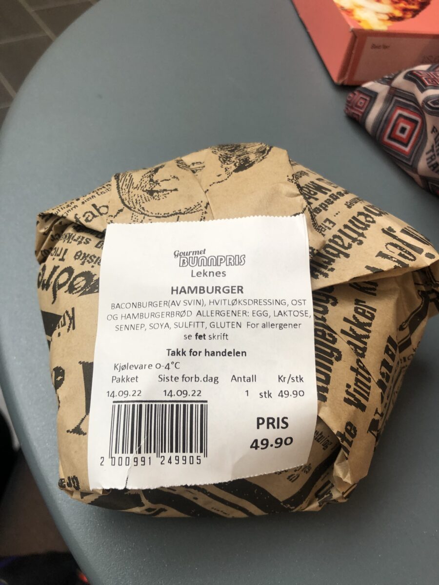 餐食:午餐:Leknes 超商熱食漢堡。 晚餐:自煮烤鮭魚、薯條、雞翅、咖喱燉飯、泰式濃湯
